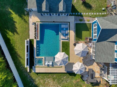 The Result – Wow – how about that pop of color. A deep teal pool matched expertly by the custom home builder and stylishly used on the inside metal roof of the pool house. This house sits just outside the Rehoboth Beach city limits and on busy days its the perfect little hideaway to relax and have some afternoon cocktails and enjoy that unicorn pool float. Who needs the hustle and bustle when you have this whimsical pool house ready to go in your own backyard? Then add in the soothing sounds of the waterfall right into the pool – pure heaven if you ask us!